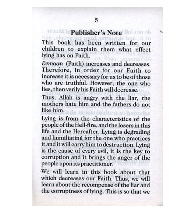 Lying Is In The Hell-Fire by Darussalam Research Division is a concise English booklet written primarily for children and young readers to explain the Islamic stance on lying, its spiritual consequences, and the importance of truthfulness based on Qur’anic wisdom and Prophetic teachings. The book shows how faith (īmān) increases with truth and decreases with falsehood, emphasizing that lying is not merely a social fault but a trait that weakens faith, harms character, and draws Allah’s displeasure. Through authentic references and discussion suitable for young minds, it stresses that liars are described in Islamic tradition as people of the Hell-Fire, and that faith increases among those who uphold truth in family, community, and everyday life.